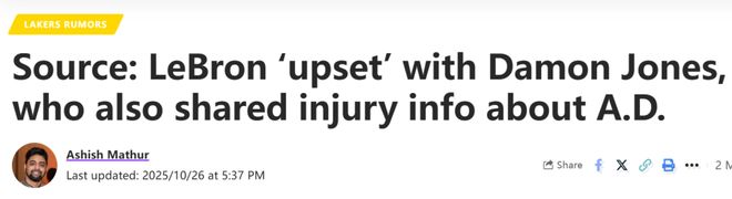 北京时间10月27日,据消息人士向《湖人日报》透露,湖人超巨詹姆斯对好友达蒙-琼斯向赌徒泄露其参赛状态的隐私信息一事感到“不满”。